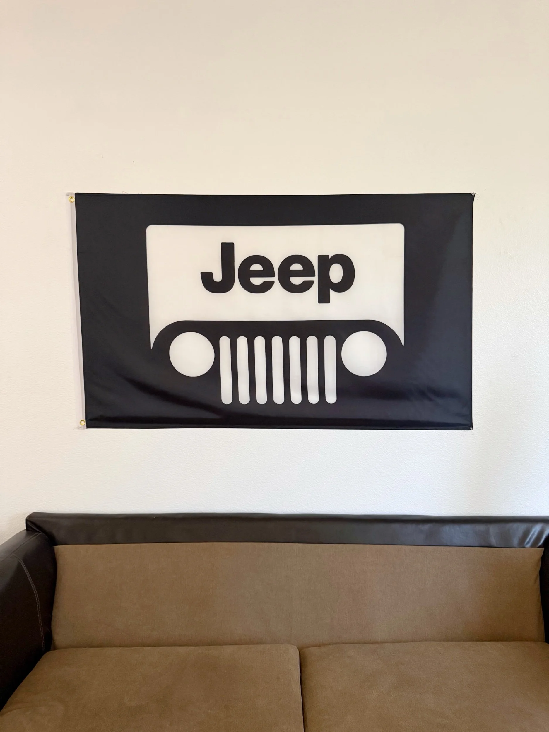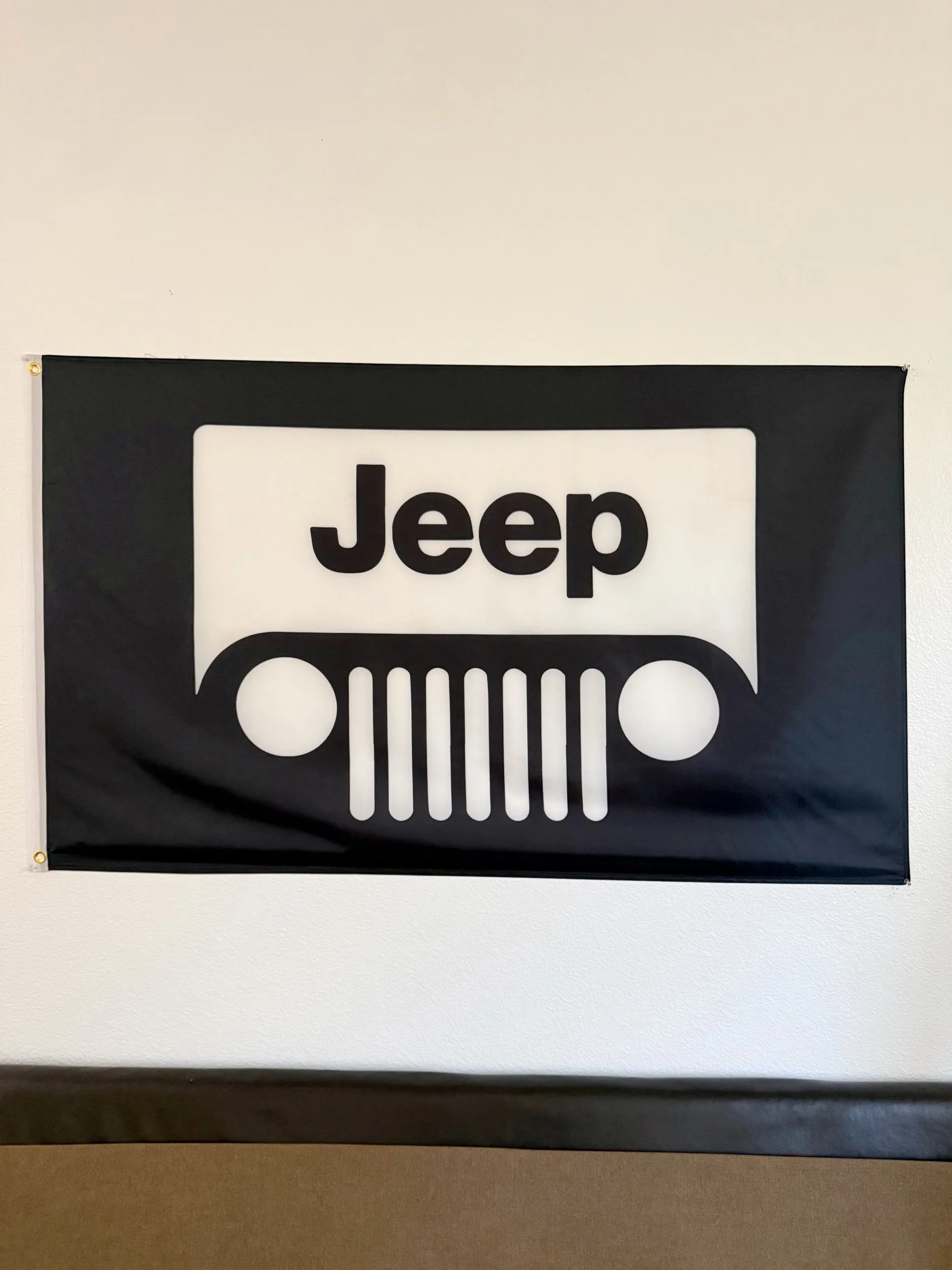 Proudly wave your Jeep spirit with this rugged Jeep flag — the perfect piece for off-roaders, adventurers, and weekend warriors. The bold design captures the true essence of freedom and exploration. Ideal for your garage, campsite, Jeep club events, or wall décor. Made from tough polyester that can handle wind, sun, and rain.